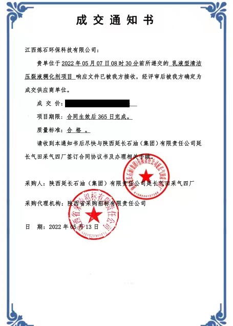 经过多轮评审,陕西延长石油(集团)有限责任公司延长气田采气四厂正式发文给公司,认可并接收公司的乳液型清洁压裂液稠化剂项目,确定公司为其成交供应商。